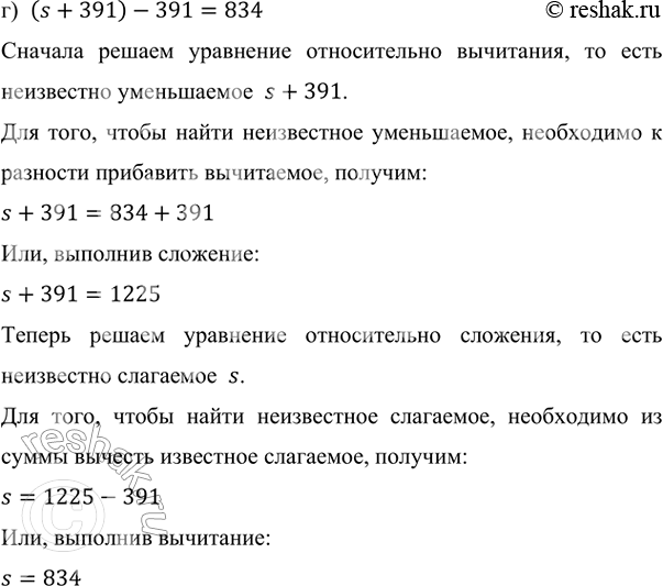 Сначала решаем уравнение относительно вычитания, то есть неизвестно уменьшаемое s+391.