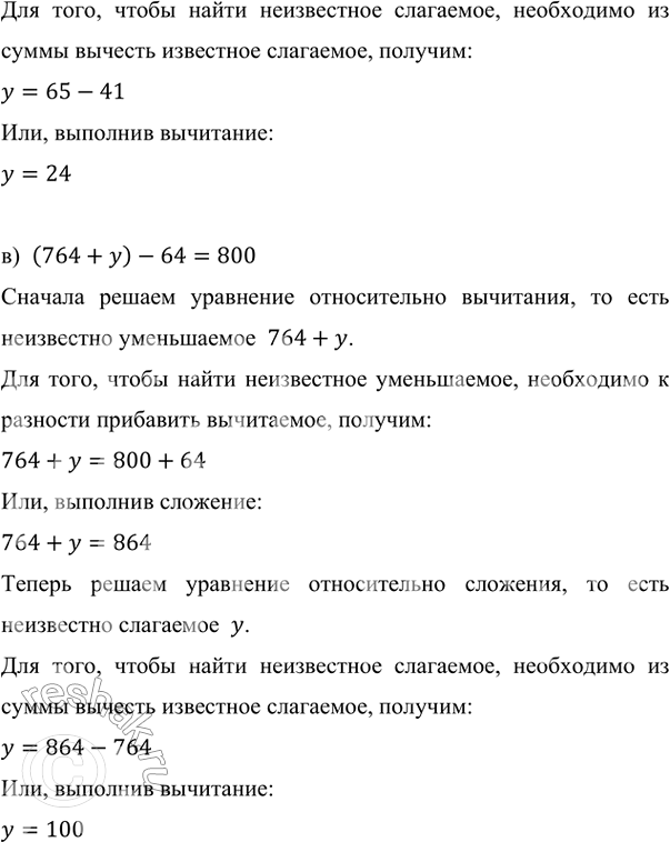 Сначала решаем уравнение относительно вычитания, то есть неизвестно уменьшаемое 764+y.