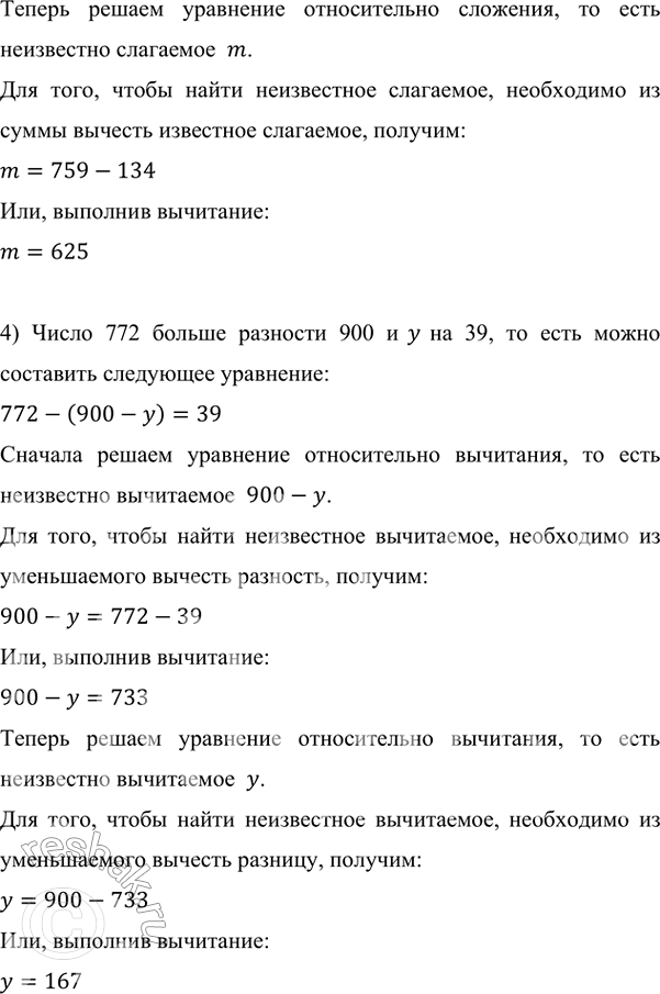 4) Число 772 больше разности 900 и y на 39, то есть можно составить следующее уравнение: