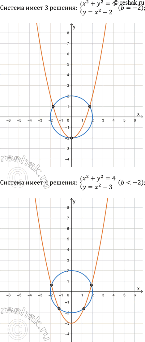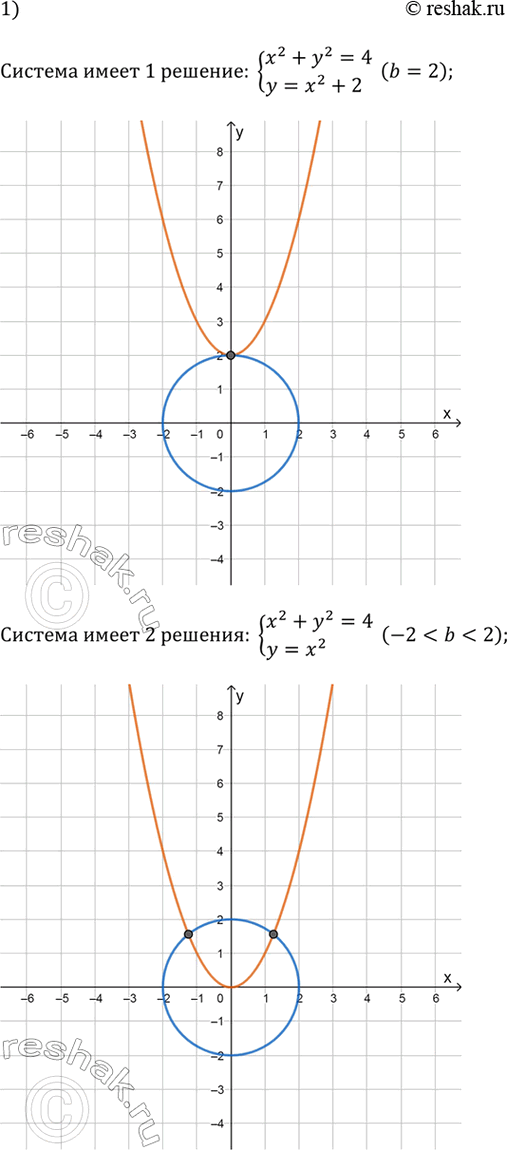 1) Система уравнений x^2 + y^2 = 4 и y = x^2 + b, где b - произвольное число, может иметь одно, два, три или четыре решения, а также не иметь решений. Проиллюстрируйте каждый случай с помощью схематического рисунка. Подберите конкретную систему, соответствующую каждому случаю.
