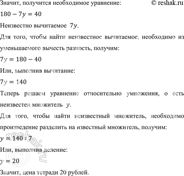 У Кати было 180 рублей, она купила 7 тетрадей по y рублей каждая и у неё осталось 40 рублей.