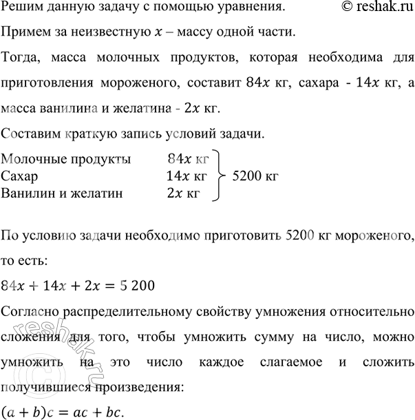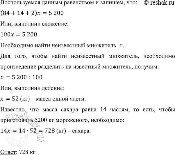 Известно, что масса сахара равна 14 частям, то есть, чтобы приготовить 5200 кг мороженого, необходимо: