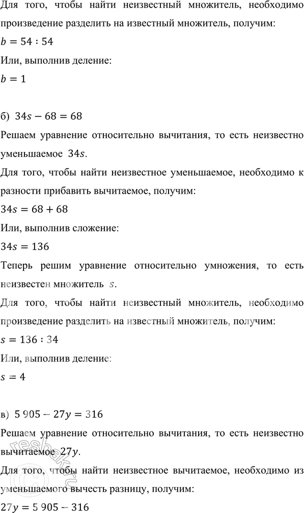 а) 54b - 28 = 26; в) 5905 - 27y = 316;