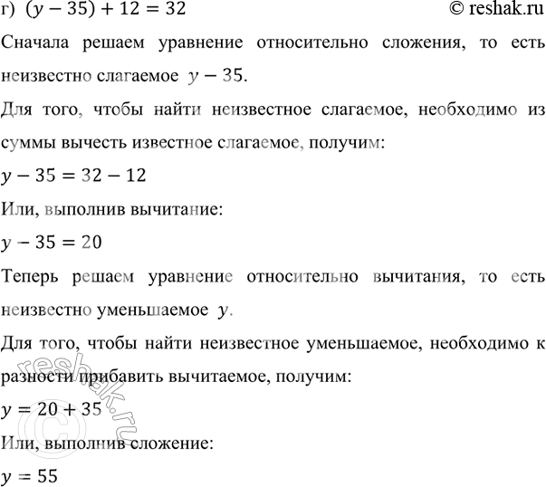 Сначала решаем уравнение относительно сложения, то есть неизвестно слагаемое y-35.