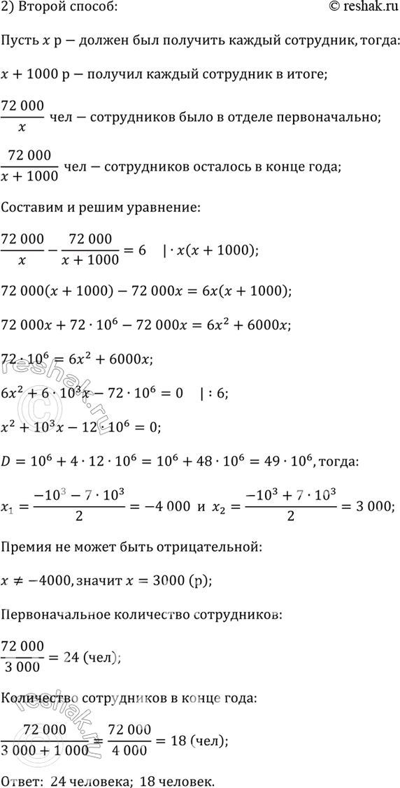 Составьте разные уравнения по условию задачи. Решите её. Премиальный фонд в 72 000 р. решено было распределить в конце года между сотрудниками отдела поровну. В течение года 6 человек ушли из отдела, поэтому каждый из сотрудников получил на 1000 р. больше, чем предполагалось. Сколько сотрудников было в отделе первоначально и сколько стало к концу года?