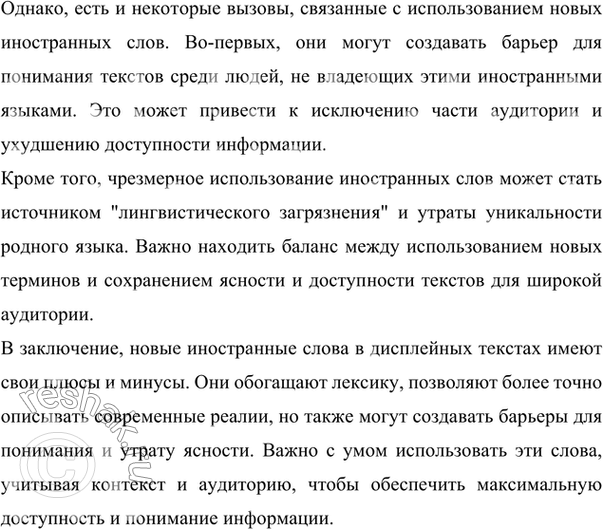Кроме того, чрезмерное использование иностранных слов может стать источником "лингвистического загрязнения" и утраты уникальности родного языка. Важно находить баланс между использованием новых терминов и сохранением ясности и доступности текстов для широкой аудитории.