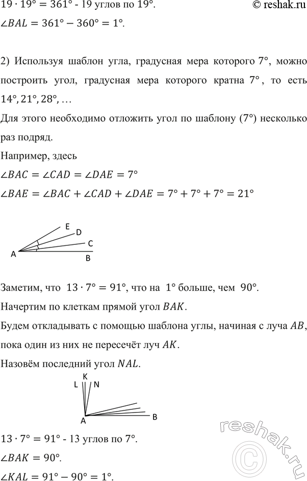 Как построить угол, градусная мера которого 1^о, используя шаблон угла, градусная мера которого равна: а) 19^о; б) 7^о?