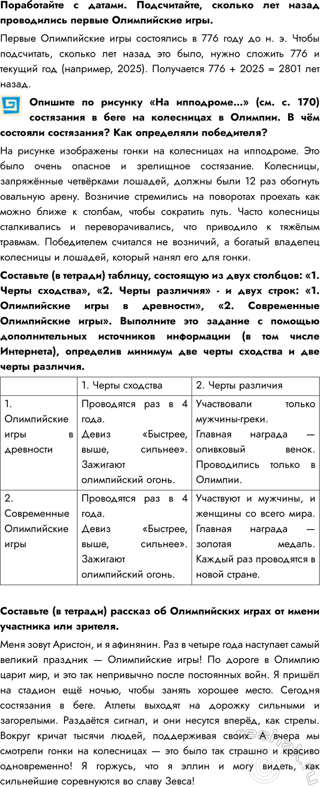Составьте (в тетради) таблицу, состоящую из двух столбцов: «1. Черты сходства», «2. Черты различия» - и двух строк: «1. Олимпийские игры в древности», «2. Современные Олимпийские игры». Выполните это задание с помощью дополнительных источников информации (в том числе Интернета), определив минимум две черты сходства и две черты различия.