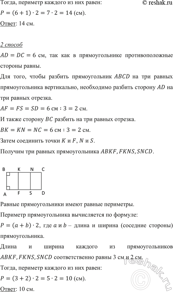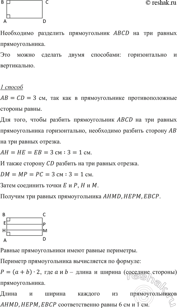 Начертите прямоугольник, соседние стороны которого равны 3 см и 6 см. Разделите его на три равных прямоугольника. Вычислите периметр каждого из полученных прямоугольников. Сколько решений имеет задача?