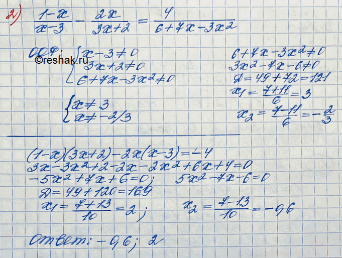 2) (1-x)/(x-3) - 2x/(3x+2) = 4/(6+7x-3x2).