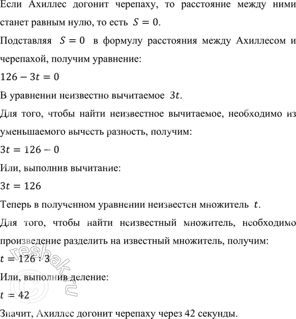 Ахиллес догоняет черепаху. Скорость Ахиллеса 4 м/с, а скорость черепахи 1 м/с. Сейчас расстояние между ними 126 м. Чему будет равно расстояние между Ахиллесом и черепахой через t с? Запишите ответ в виде формулы и упростите её. Какой смысл имеет число 3 в этой формуле? Через сколько секунд Ахиллес догонит черепаху?