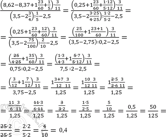 ((8,62-8,37+1 23/60+1/5)•3/11)/((3,5-2 3/4) :1/5-2,5)=((0,25+1 23/60+(1•12)/(5•12))•3/11)/((3,5-2 (3•25)/(4•25)) :(1•2)/(5•2)-2,5)=((0,25+1 23/60+12/60)•3/11)/((3,5-2 75/100) :2/10-2,5)=((25/100+1 (23+12)/60)•3/11)/((3,5-2,75) :0,2-2,5)=((25/(4•25)+1 35/60)•3/11)/(0,75:0,2-2,5)=(((1•3)/(4•3)+1 (5•7)/(5•12))•3/11)/(7,5 :2-2,5)=((3/12+1 7/12)•3/11)/(3,75-2,5)=(1 (3+7)/12•3/11)/1,25=(1 10/12•3/11)/1,25=(1 (2•5)/(2•6)•3/11)/1,25=(11/6•3/11)/1,25=((11•3)/(6•11))/1,25=(3/(3•2))/1,25=((1•5)/(2•5))/1,25=(5/10)/1,25=0,5/1,25=50/125=(25•2)/(25•5)=(2•2)/(5•2)=4/10=0,4