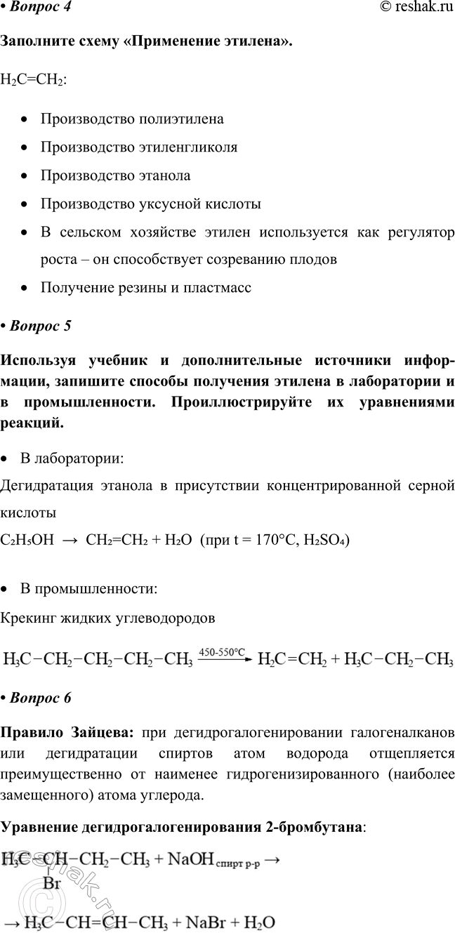 Используя учебник и дополнительные источники инфор-мации, запишите способы получения этилена в лаборатории и в промышленности. Проиллюстрируйте их уравнениями реакций.