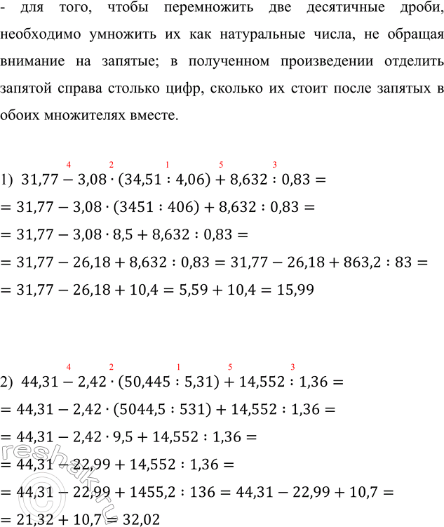1) 31,77-3,08•(34,51:4,06)+8,632:0,83=31,77-3,08•(3451:406)+8,632:0,83=31,77-3,08•8,5+8,632:0,83=31,77-26,18+8,632:0,83=31,77-26,18+863,2:83=31,77-26,18+10,4=5,59+10,4=15,99