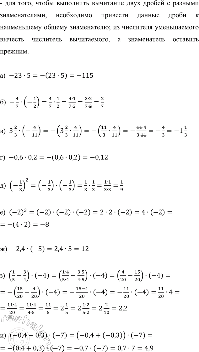 з) (1/5-3/4)•(-4)=((1•4)/(5•4)-(3•5)/(4•5))•(-4)=(4/20-15/20)•(-4)=-(15/20-4/20)•(-4)=-(15-4)/20•(-4)=-11/20•(-4)=11/20•4=(11•4)/20=(11•4)/(4•5)=11/5=2 1/5=2 (1•2)/(5•2)=2 2/10=2,2