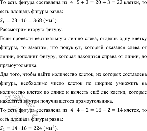 В задаче представленные фигуры составлены из одинаковых клеток, значит, чтобы найти площадь данных фигур, необходимо число клеток, из которых составлена фигура, умножить на площадь одной клетки.