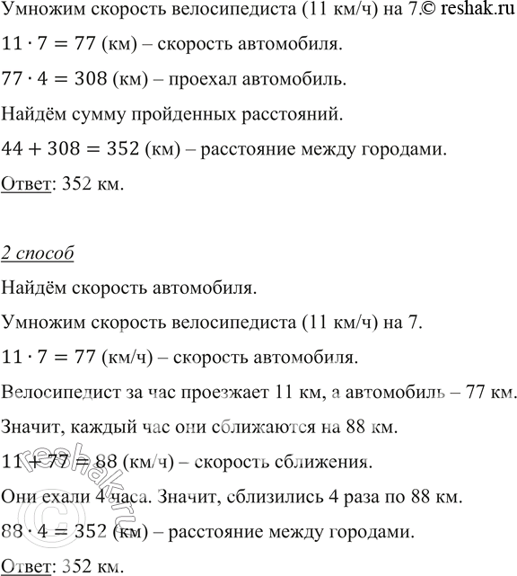 Из двух городов одновременно навстречу друг другу выехали велосипедист и легковой автомобиль. Велосипедист ехал со скоростью 11 км/ч, а автомобиль — в 7 раз быстрее. Найдите расстояние между городами, если велосипедист и автомобиль встретились через 4 ч после начала движения.