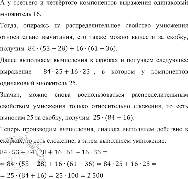 Тогда, опираясь на распределительное свойство умножения относительно вычитания, его также можно вынести за скобку, получим 84•(53-28)+16•(61-36).