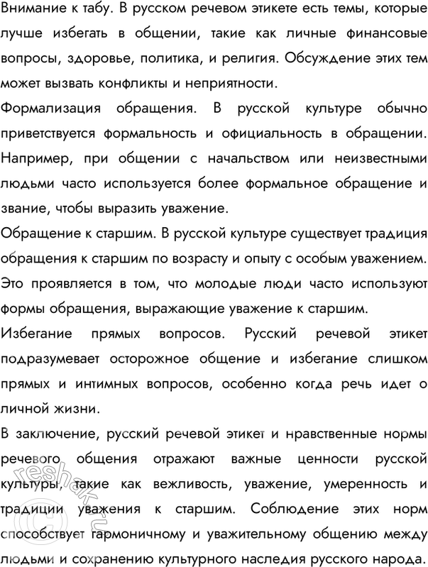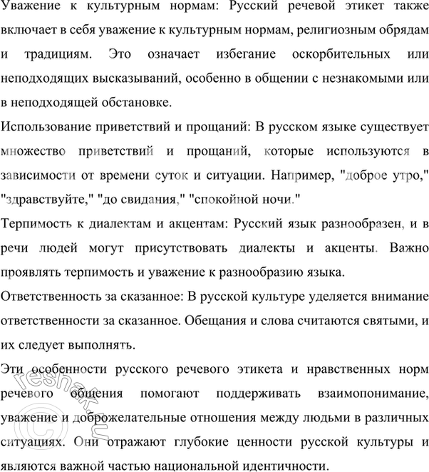 В заключение, русский речевой этикет и нравственные нормы речевого общения отражают важные ценности русской культуры, такие как вежливость, уважение, умеренность и традиции уважения к старшим. Соблюдение этих норм способствует гармоничному и уважительному общению между людьми и сохранению культурного наследия русского народа.