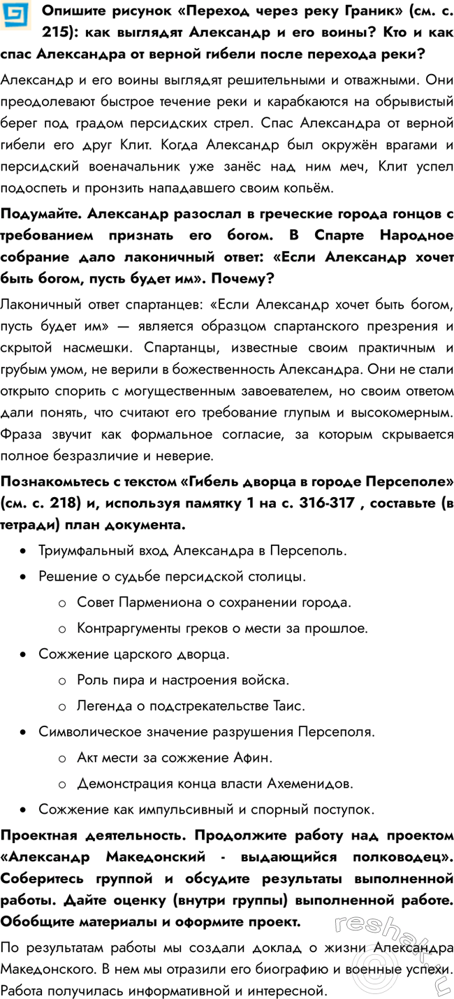 Опишите рисунок «Переход через реку Граник» (см. с. 215): как выглядят Александр и его воины? Кто и как спас Александра от верной гибели после перехода реки?