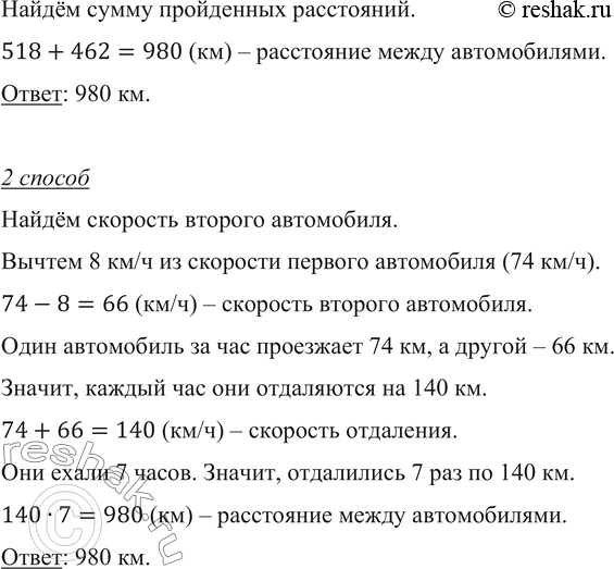 518+462=980 (км) – расстояние между автомобилями.