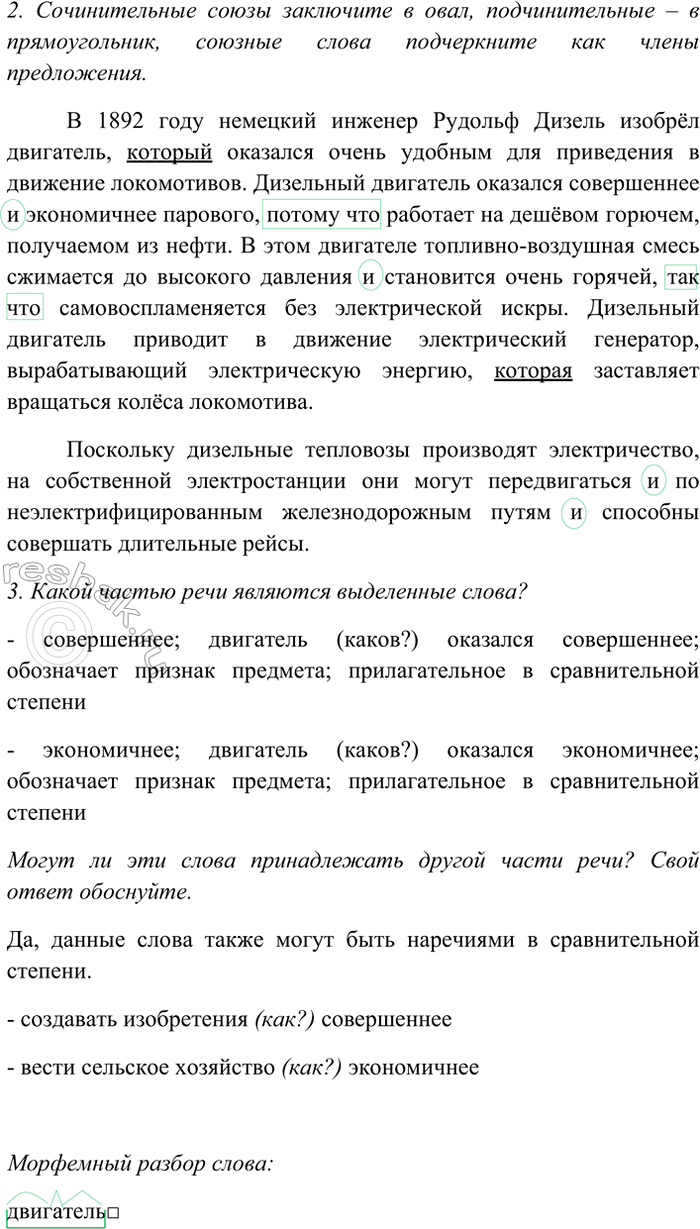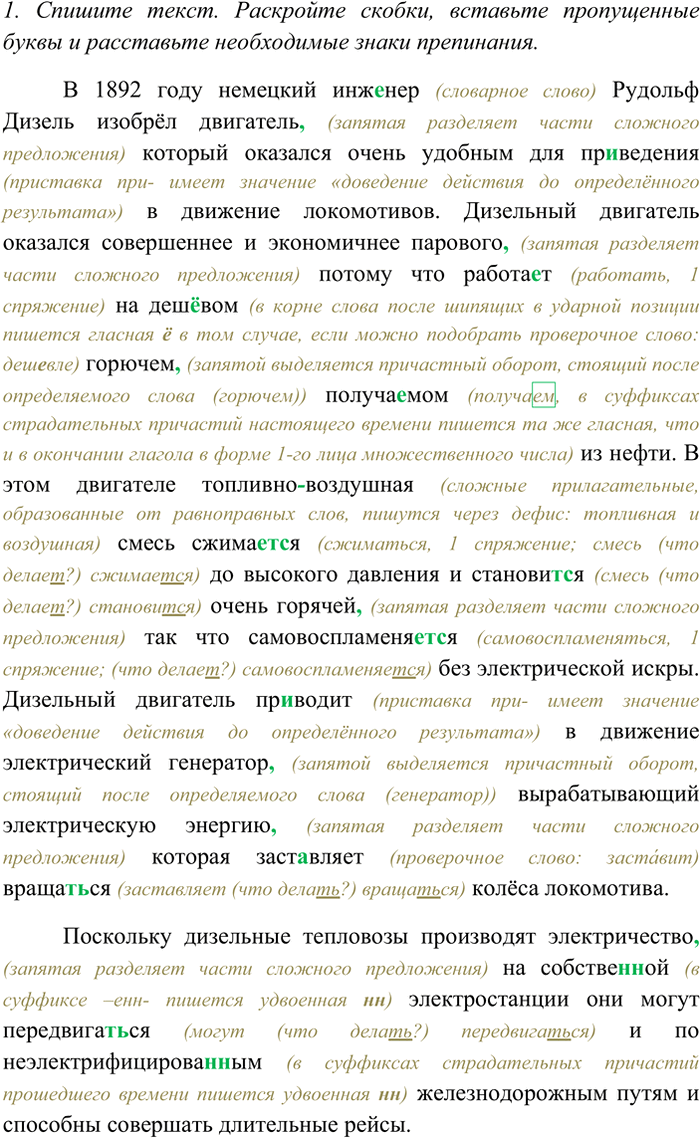 В 1892 году немецкий инженер (словарное слово) Рудольф Дизель изобрёл двигатель, (запятая разделяет части сложного предложения) который оказался очень удобным для приведения (приставка при- имеет значение «доведение действия до определённого результата») в движение локомотивов. Дизельный двигатель оказался совершеннее и экономичнее парового, (запятая разделяет части сложного предложения) потому что работает (работать, 1 спряжение) на дешёвом (в корне слова после шипящих в ударной позиции пишется гласная ё в том случае, если можно подобрать проверочное слово: дешевле) горючем, (запятой выделяется причастный оборот, стоящий после определяемого слова (горючем)) получаемом (получаем, в суффиксах страдательных причастий настоящего времени пишется та же гласная, что и в окончании глагола в форме 1-го лица множественного числа) из нефти. В этом двигателе топливно-воздушная (сложные прилагательные, образованные от равноправных слов, пишутся через дефис: топливная и воздушная) смесь сжимается (сжиматься, 1 спряжение; смесь (что делает?) сжимается) до высокого давления и становится (смесь (что делает?) становится) очень горячей, (запятая разделяет части сложного предложения) так что самовоспламеняется (самовоспламеняться, 1 спряжение; (что делает?) самовоспламеняется) без электрической искры. Дизельный двигатель приводит (приставка при- имеет значение «доведение действия до определённого результата») в движение электрический генератор, (запятой выделяется причастный оборот, стоящий после определяемого слова (генератор)) вырабатывающий электрическую энергию, (запятая разделяет части сложного предложения) которая заставляет (проверочное слово: заставит) вращаться (заставляет (что делать?) вращаться) колёса локомотива.