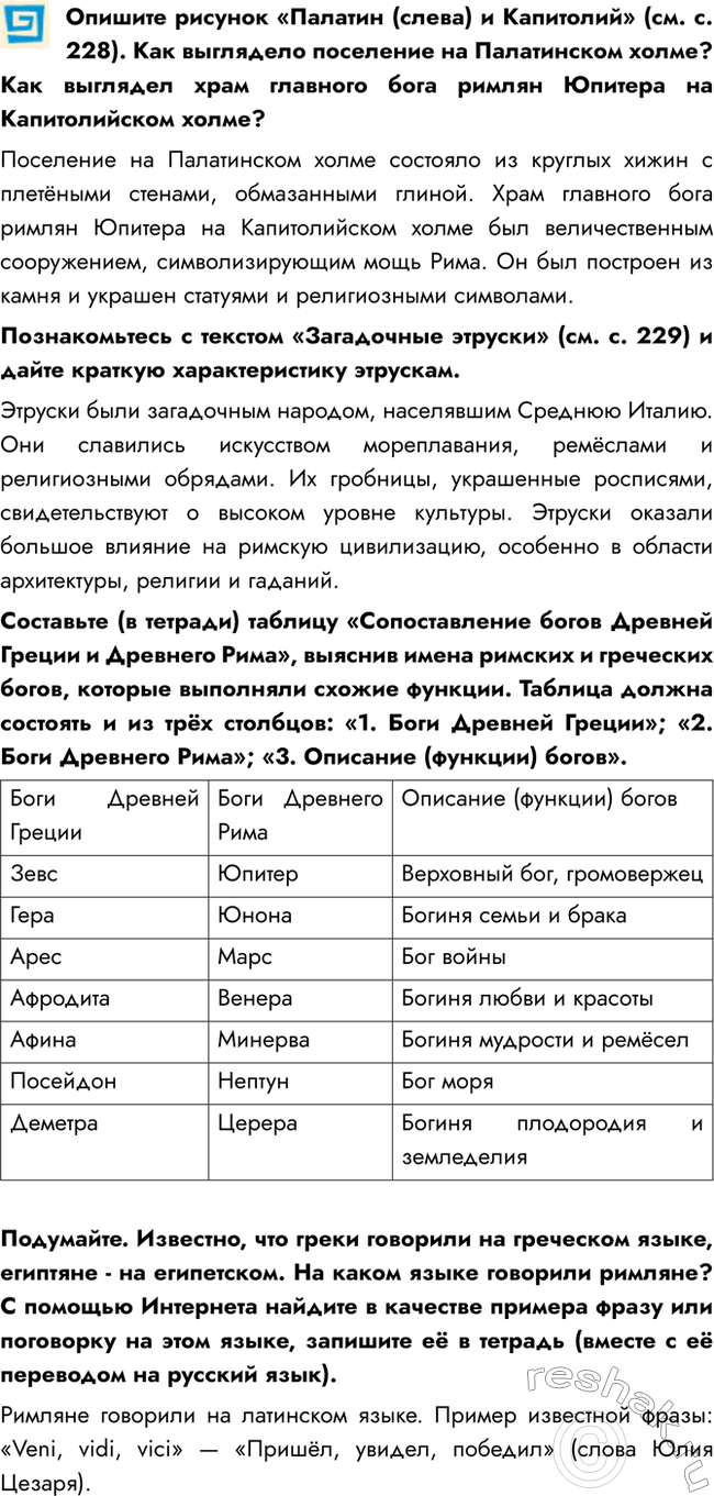 Опишите рисунок «Палатин (слева) и Капитолий» (см. с. 228). Как выглядело поселение на Палатинском холме? Как выглядел храм главного бога римлян Юпитера на Капитолийском холме?