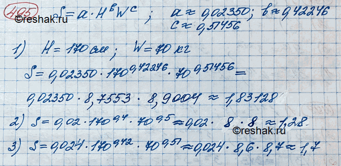 495. Для успешного лечения пациента медикам приходится оценивать площадь поверхности тела больного. Ни рост, ни вес в отдельности не являются полноценной характеристикой площади поверхности кожного покрова человека. На основе многочисленных экспериментов в 1916 г. два медика Д. Ф. Дьюбос и Е. Ф. Дьюбос предложили формулу для вычисления в квадратных метрах площади поверхности человеческого тела: S = aHbWc, где H — рост человека (см), W — вес человека (кг), коэффициенты а, b и с — числа, которые на 401-м испытуемом были определены учёными Е. Гелханом и С. Джорджем так: а = 0,02350, b = 0,42246, с = 0,51456. Найти площадь поверхности S тела человека, имеющего рост 170 см и вес 70 кг. Найти S того же человека, округлив значения коэффициентов а, Ь и с до одной значащей цифры; до двух значащих цифр.