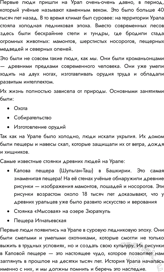 Первые люди пришли на Урал очень-очень давно, в период, который учёные называют каменным веком. Это было больше 40 тысяч лет назад. В то время климат был суровее: на территории Урала стояла холодная ледниковая эпоха. Вместо современных лесов здесь были бескрайние степи и тундры, где бродили стада огромных животных: мамонтов, шерстистых носорогов, пещерных медведей и северных оленей.