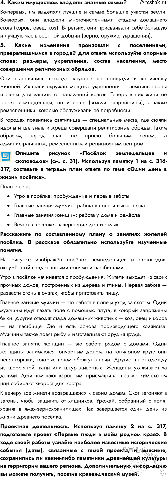 Опишите рисунок «Посёлок земледельцев и скотоводов» (см. с. 31). Используя памятку 1 на с. 316-317, составьте в тетради план ответа по теме «Один день в жизни посёлка».