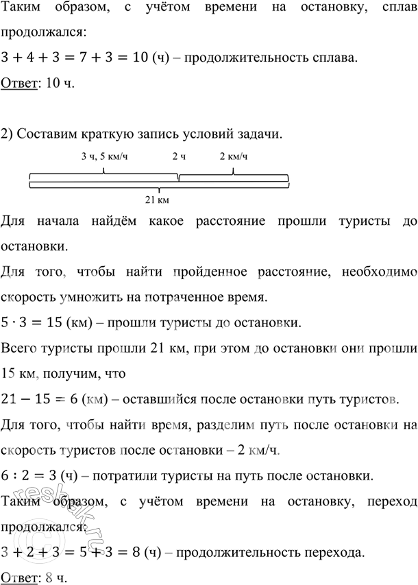 2) Группа туристов по ориентированию на местности первые 3 ч шла со скоростью 5 км/ч и сделала остановку на 2 ч, а остальное время шла по гористой местности со скоростью 2 км/ч. Сколько времени группа затратила на весь переход длиной 21 км?