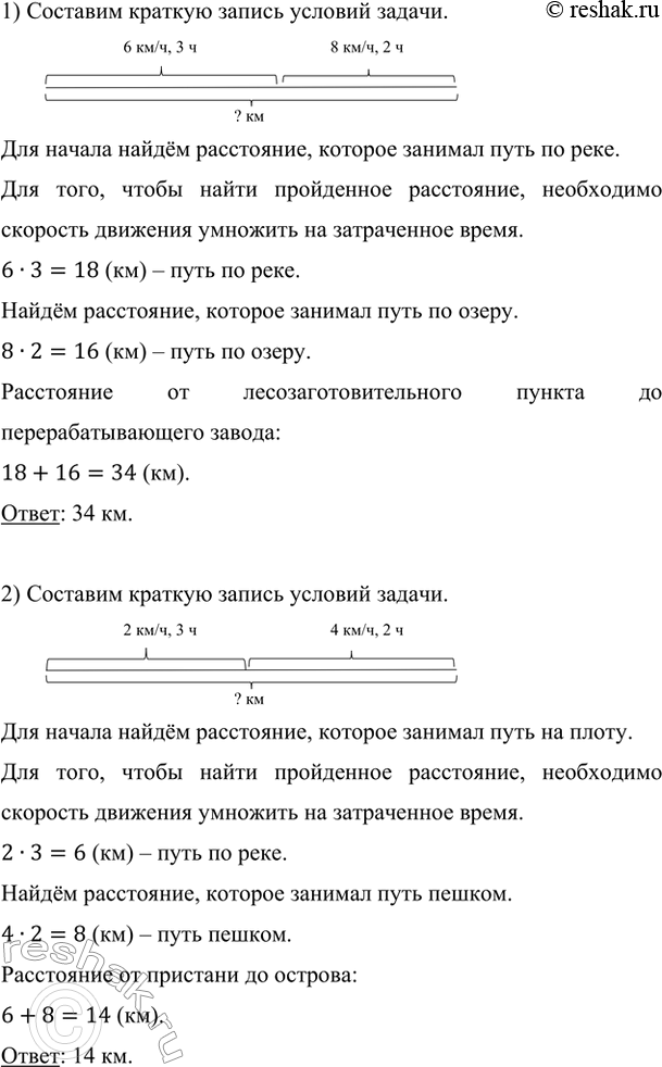 1) От лесозаготовительного пункта до деревоперерабатывающего завода лес сначала сплавляли по реке, скорость которой 6 км/ч, а затем буксировали по озеру. Найдите расстояние от лесозаготовительного пункта до деревоперерабатывающего завода, если сплав по реке занял 3 ч, а буксировка по озеру — 2 ч со скоростью 8 км/ч.