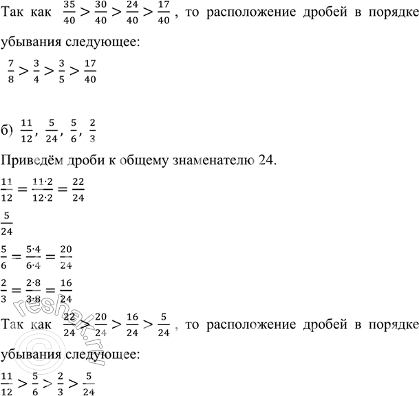 Дроби расположите в порядке убывания: а) 7/8, 3/4, 3/5, 17/40; б) 11/12, 5/24, 5/6, 2/3.