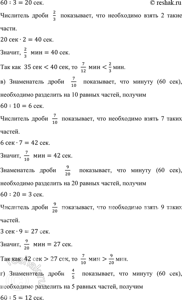 г) Знаменатель дроби 4/5 показывает, что минуту (60 сек), необходимо разделить на 5 равных частей, получим