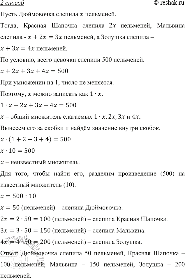 Дюймовочка слепила одну часть всех пельменей, Красная Шапочка – 2 такие же части (в 2 раза больше Дюймовочки), Мальвина – 3 такие же части (столько же, сколько Дюймовочка и Красная Шапочка вместе 1+2=3), Золушка – 4 такие же части (столько же, сколько Дюймовочка и Мальвина вместе 1+3=4).