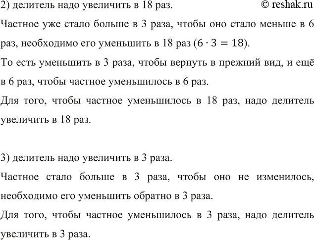 Делимое увеличили в 3 раза. Как надо изменить делитель, чтобы частное: 1) увеличилось в 6 раз; 2) уменьшилось в 6 раз; 3) не изменилось?