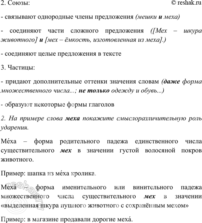 В (предлог) наше время слова «мешок» и (союз) «мех» служат названием предметов, которые не (частица) имеют ничего общего ни (частица) по (предлог) внешнему виду, ни (частица) по (предлог) значению. Даже (частица) форма множественного числа образуется неодинаково: мешки и (союз) меха. Между тем история этих слов уводит нас к (предлог) одному слову и (союз) одному предмету. Речь идёт о (предлог) мехе или (союз) шкуре животного. Наши предки шили из (предлог) меха не (частица) только (частица) одежду и (союз) обувь, но (союз) и (союз) мешки для (предлог) хранения соли, зерна, других сыпучих веществ. Такие ёмкости носили название мехов. Мех – шкура животного и (союз) мех – ёмкость, изготовленная из (предлог) меха. В (предлог) старой пословице мы встречаем: «Шила в (предлог) мешке не (частица) утаишь». Мешок – слово с (предлог) уменьшительным суффиксом.