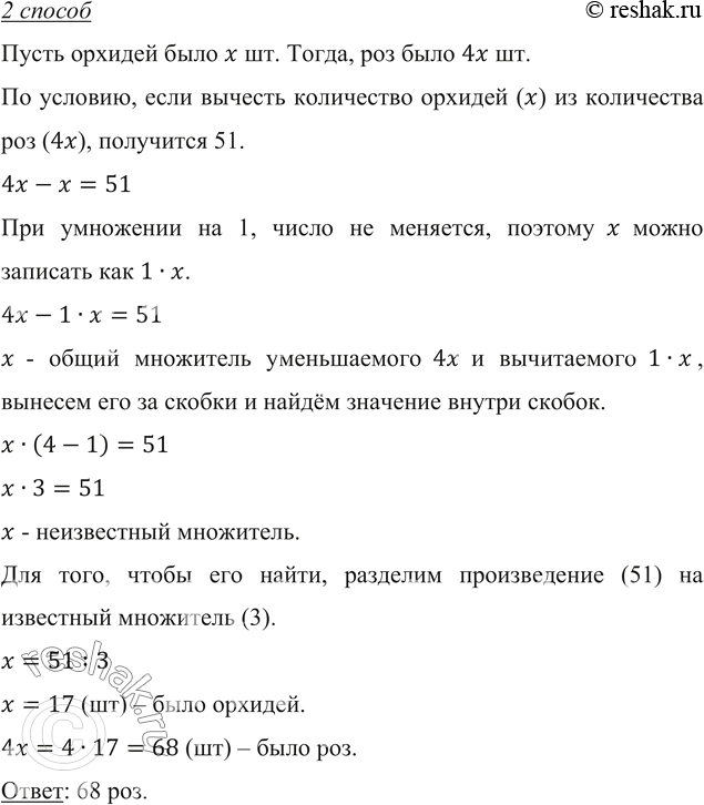 По условию, если вычесть количество орхидей (x) из количества роз (4x), получится 51.