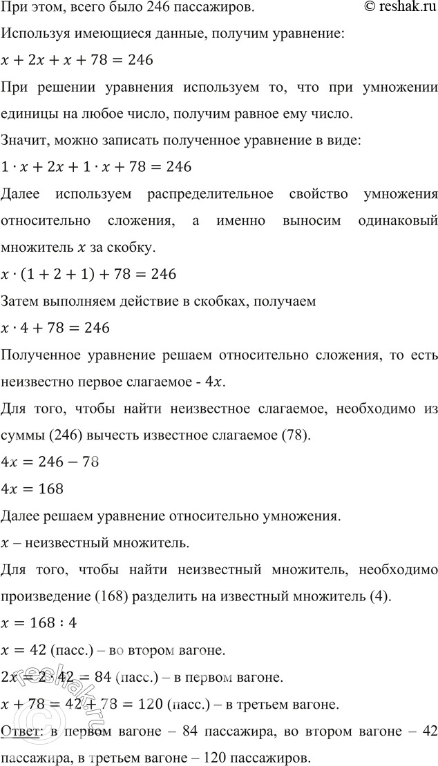 В трёх вагонах электропоезда ехало 246 пассажиров. В первом вагоне было в 2 раза больше пассажиров, чем во втором, а в третьем — на 78 пассажиров больше, чем во втором. Сколько пассажиров ехало в каждом вагоне?