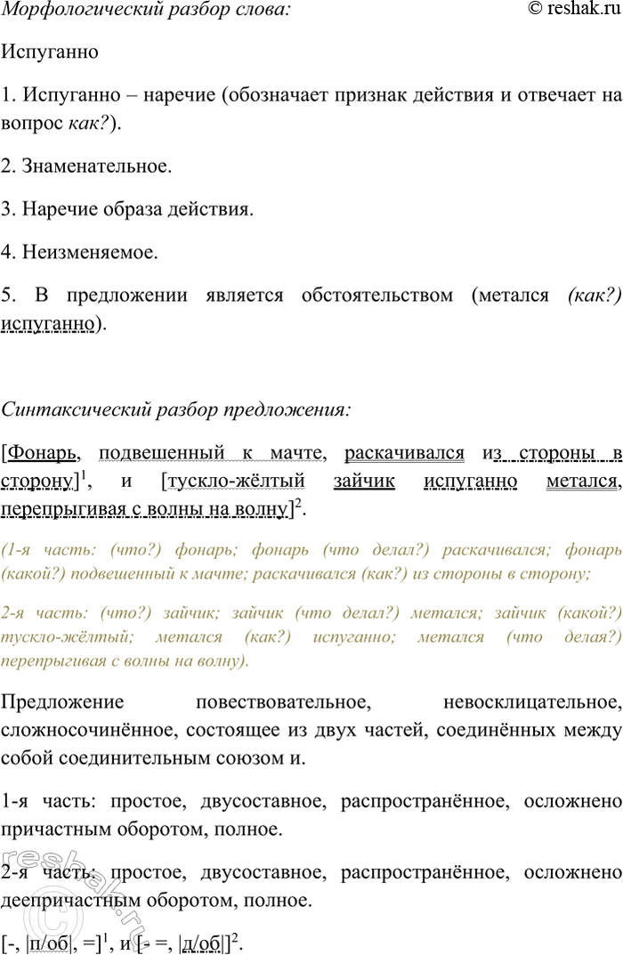 [Фонарь, подвешенный к мачте, раскачивался из стороны в сторону]1, и [тускло-жёлтый зайчик испуганно метался, перепрыгивая с волны на волну]2.