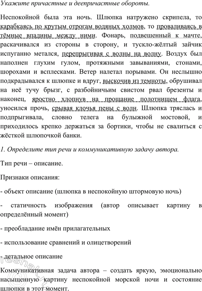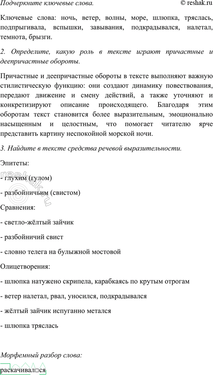 Причастные и деепричастные обороты в тексте выполняют важную стилистическую функцию: они создают динамику повествования, передают движение и смену действий, а также уточняют и конкретизируют описание происходящего. Благодаря этим оборотам текст становится более выразительным, эмоционально насыщенным и целостным, что помогает читателю ярче представить картину неспокойной морской ночи.