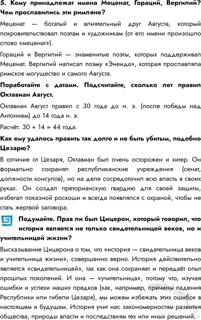 Высказывание Цицерона о том, что «история — свидетельница веков и учительница жизни», совершенно верно. История действительно является «свидетельницей», так как она сохраняет и передаёт опыт прошлых поколений. И она — «учительница», потому что, изучая ошибки и успехи наших предков (как, например, причины падения Республики или гибели Цезаря), мы можем избежать этих ошибок в настоящем и будущем. История учит нас закономерностям развития общества, природы власти и последствиям тех или иных решений.