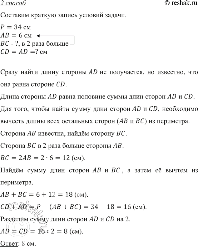 Периметр четырёхугольника ABCD равен 34 см, AВ = 6 см, сторона ВС в 2 раза больше стороны AВ, стороны CD и AD равны. Вычислите длину стороны AD.