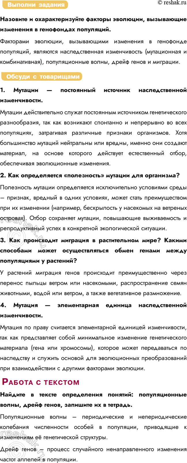 § 6. Факторы эволюции, вызывающие изменения в генофонде популяции: наследственная изменчивость, популяционные волны, дрейф генов, миграции