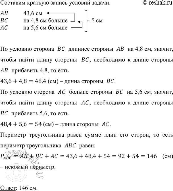 У треугольника АВС сторона АВ равна 43,6 см, сторона ВС на 4,8 см длиннее АВ, сторона АС на 5,6 см длиннее ВС. Вычислите периметр треугольника