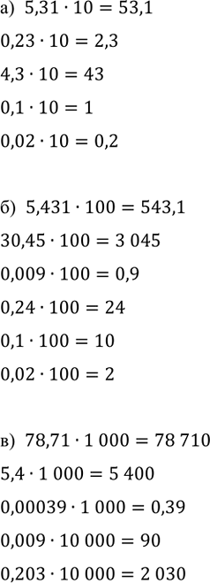 б) 5,431 · 100, 30,45 · 100, 0,009 · 100, 0,24 · 100, 0,1 · 100, 0,02 · 100;