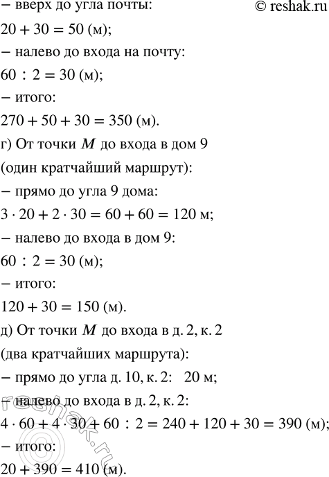 Развивай мышление. Схематический план квартала города показан на рисунке 61. Предложите кратчайший путь от точки М до входа в: а) детский сад; б) школу; в) почту; г) дом 9; д) дом 2, корпус 2. Вычислите этот путь, если расстояние между домами равно 20 м и у каждого дома ширина 20 м. а длина 60 м.