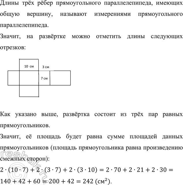3) Какова площадь этой развёртки, если измерения параллелепипеда равны 10 см, 7 см и 3 см?