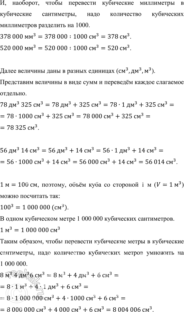 Выразите в кубических сантиметрах: 8 дм^3; 62 дм^3; 378 000 мм^3; 520 000 мм^3; 78 дм^3 325 см^3; 56 дм^3 14 см^3; 8 м^3 4 дм^3 6 см^3.