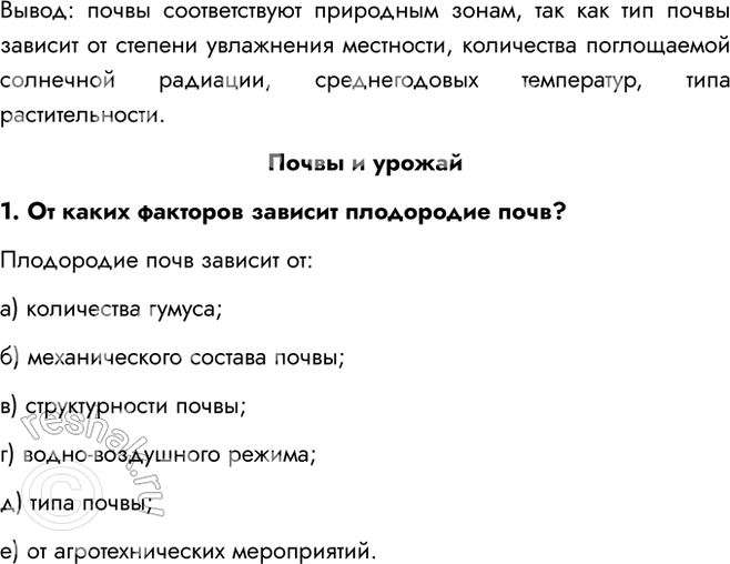 Вывод: почвы соответствуют природным зонам, так как тип почвы зависит от степени увлажнения местности, количества поглощаемой солнечной радиации, среднегодовых температур, типа растительности.